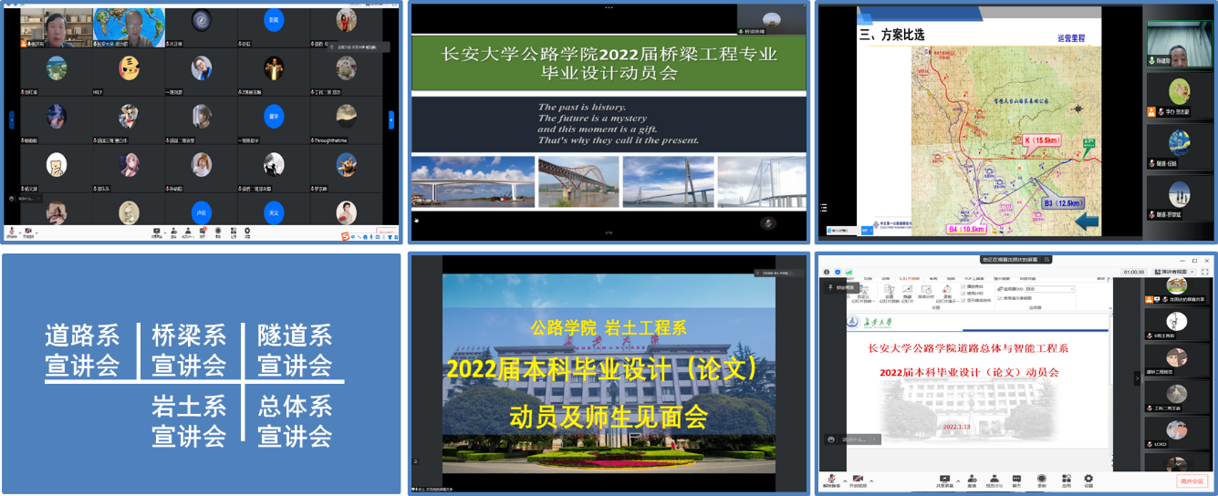 为进一步加强本科毕业设计过程管理,全面提高人才培养质量,2022年1月13日晚7时,公司召开道路桥梁与渡河工程专业2022届本科毕业设计线上动员会。公司经理陈建勋、副经理张久鹏、各系主任和本科教学副主任,150名指导老师和478名道路桥梁与渡河工程专业2018级员工参加动员会。线上动员会分全体动员会、各专业方向宣讲会两个阶段,由张久鹏和各系主任分别主持。