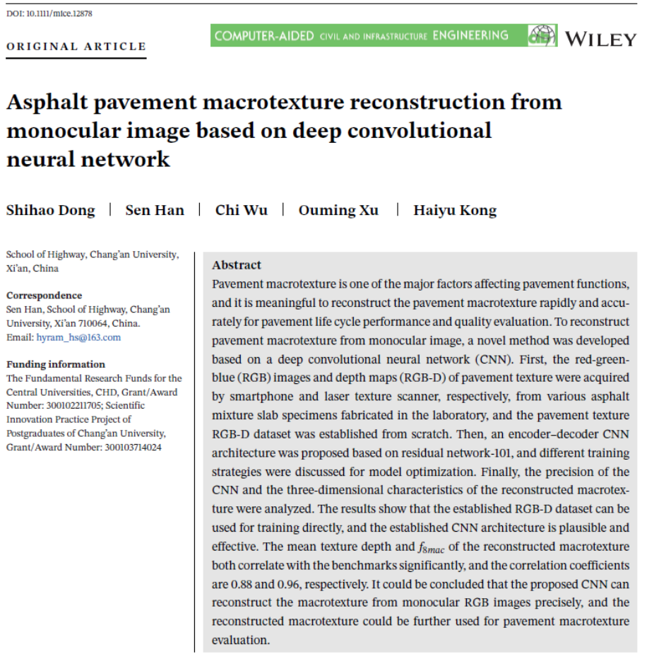 近日,公司2026世界杯官网博士生董仕豪在导师韩森教授和徐鸥明教授共同指导下,在土木工程领域顶级期刊《Computer-Aided Civil and Infrastructure Engineering》发表研究论文“Asphalt pavement macrotexture reconstruction from monocular image based on deep convolutional neural network”( 基于深度卷积神经网络的单目图像的沥青路面宏观纹理重构)。