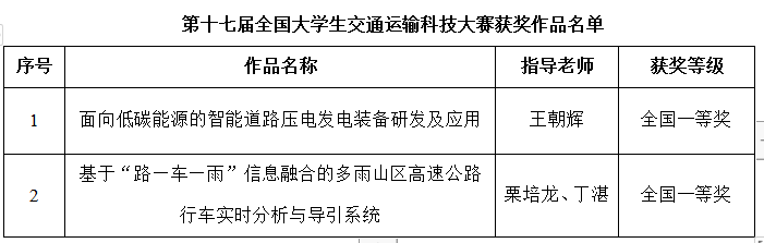 第十七届全国交通运输科技大赛共计177所高校的1473件作品参赛,94所高校共213件作品进入决赛,入围率仅14%。本年度进一步将研究生赛道精细化分为博士生、硕士生两个分赛道,其中博士生赛道全国仅7件作品入围决赛。王朝辉教授指导的作品《面向低碳能源的智能道路压电发电装备研发及应用》在博士生赛道中获得唯一的全国一等奖,这是公司目前在本项赛事研究生赛道中获得的最好成绩。栗培龙教授、丁湛副教授指导的作品《基于“路—车—雨”信息融合的多雨山区高速公路行车实时分析与导引系统》获本科生赛道全国一等奖,这也是继第十四届全国老员工交通运输科技大赛之后,公司师生再一次获得本科生赛道全国一等奖。