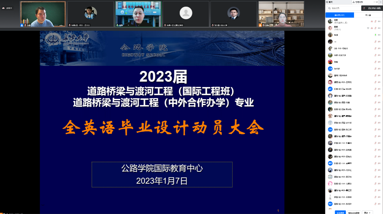 2023年1月7日上午9:00,公司国际教育中心面向道路桥梁与渡河工程(国际工程班)及道路桥梁与渡河工程(中外合作办学)专业召开了2023届全英文毕业设计(论文)动员会。双语教学团队50余名指导教师及200余名员工参会。会议由国际教育中心副主任李鹏主持。