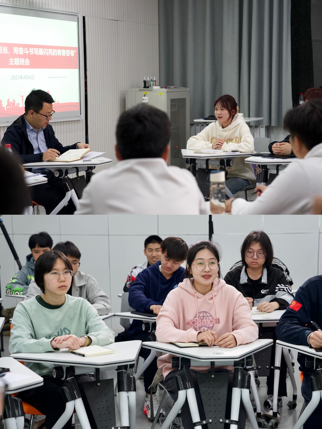 班会上,班长张友强、团支书孙朱旭分别从班级学风建设、团支部组织建设以及班级成员参与科创科研竞赛、志愿服务活动等方面介绍了班级取得的成绩。员工代表刘佳媛、熊昭文、王浩宇、田静、袁伟等围绕对疫情防控政策调整的认识、个人成长发展预期、“后疫情时代”个人职业生涯规划等分享了大学三年来的学习生活情况。陈志坚针对同学们分享的内容,从抗击疫情的信心和底气、凝聚抗击疫情的磅礴力量、发挥中国特色社会主义制度优势、为实现中华民族伟大复兴的中国梦凝聚精神力量四个方面,用丰富的事例与同学们分享了三年疫情防控中自己的体会,对同学们为维护校园安全稳定作出的贡献表示充分肯定,为广大青年在抗疫实践中所展现的良好精神风貌和优异表现点赞。