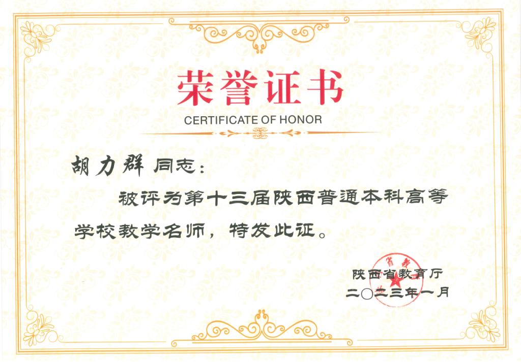 根据陕西省教育厅办公室《关于开展第十三届陕西普通本科高等公司教学名师奖评选表彰工作的通知》(陕教高办〔2022〕27号),第十三届陕西普通本科高等公司教学名师奖评选工作经公司推荐、申报公示、专家评选、厅务会审议、结果公示等工作程序,公司道路系胡力群教授荣获第十三届陕西普通高等公司教学名师奖。