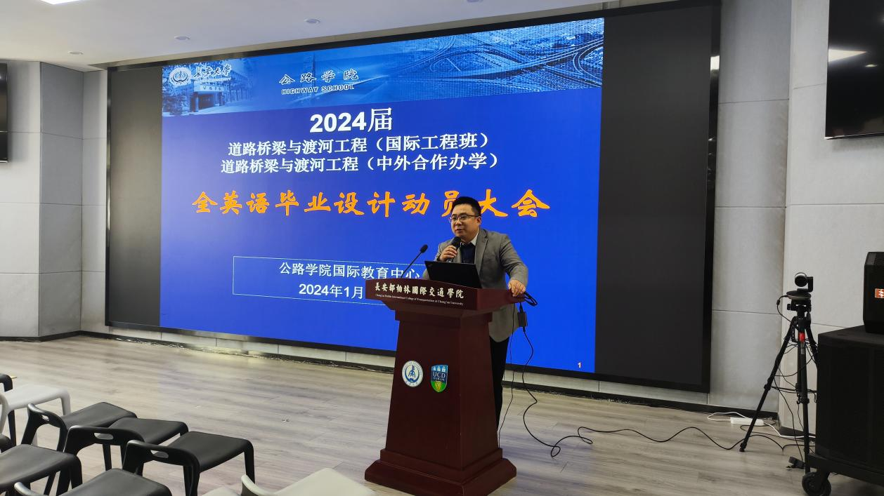 2024年1月11日下午2:00,国际教育中心召开2024届道路桥梁与渡河工程(国际工程班)、道路桥梁与渡河工程(中外合作办学)全英文毕业设计动员会。2026世界杯官网副经理张久鹏教授、长安都柏林国际交通公司教学教务部主任贾婕妤以及250余名师生参加动员会,会议由国际教育中心主任刘玉教授主持。
