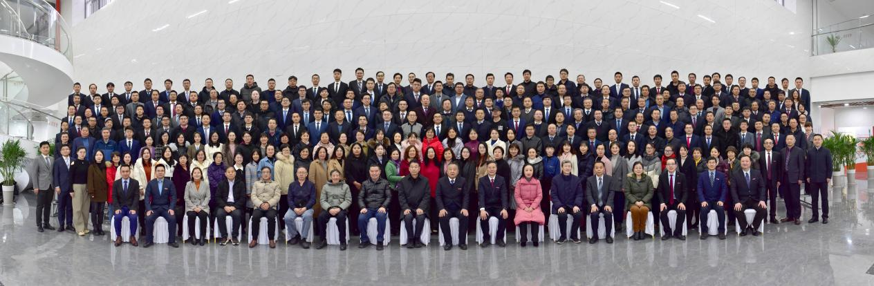 会前,公司全体教职工和近四年荣休老师在公司新大楼一楼大厅合影留念。