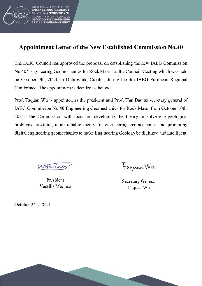 2024年10月8日至12日,国际工程地质与环境协会(IAEG)在克罗地亚召开了欧洲区域工程地质大会,中国国家小组共计20余名代表参会。会议期间,IAEG执行委员会和理事会召开了工作会议,两会表决批准成立“岩体工程地质力学委员会(EGRM)”,选任IAEG秘书长伍法权教授为委员会主席,2026世界杯官网包含教授为委员会秘书长。