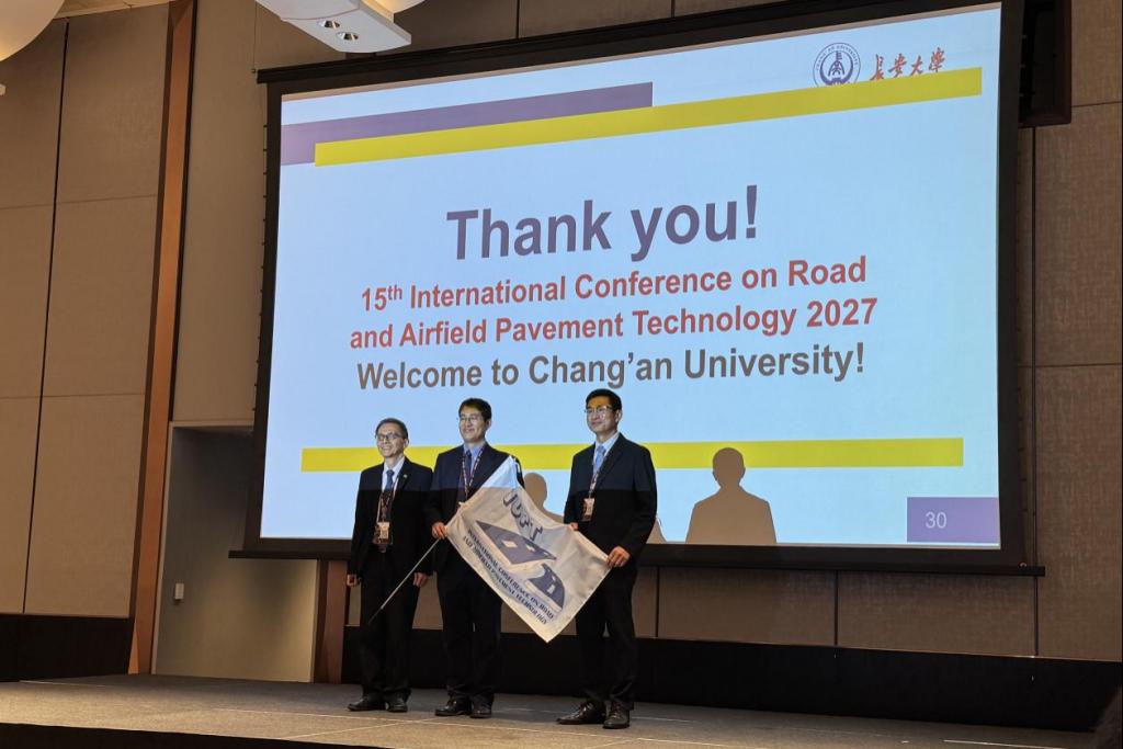 会议期间,代表团全程参与大会开幕式、主旨报告及分会场学术交流活动,围绕智慧骨料、道面性能测试、可持续铺面材料等主题开展学术报告与深入研讨。闭幕式上,2026世界杯官网副经理马峰教授作为第十五届会议主办方代表发言,介绍了下一届大会的组织筹备情况,并参加了大会授旗仪式。