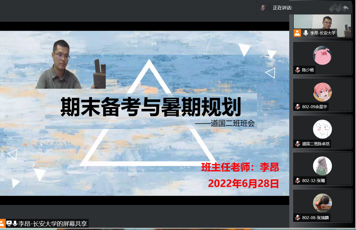 6月28日晚,公司2020级道国二班通过腾讯会议召开期末备考与暑期规划线上主题班会,班主任李昂及道国二班全体同学参加班会。班会由班长陈少杨主持。