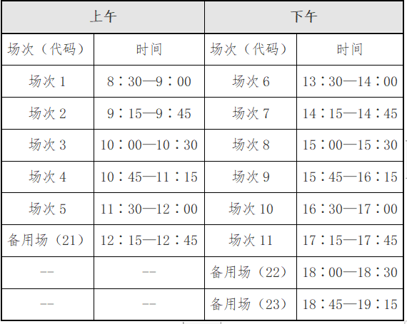 英语四级口语考试(CET-SET4)考试时间为5月21日(F221次),英语六级口语考试(CET-SET6)考试时间为5月22日(S222次),具体场次安排如下: