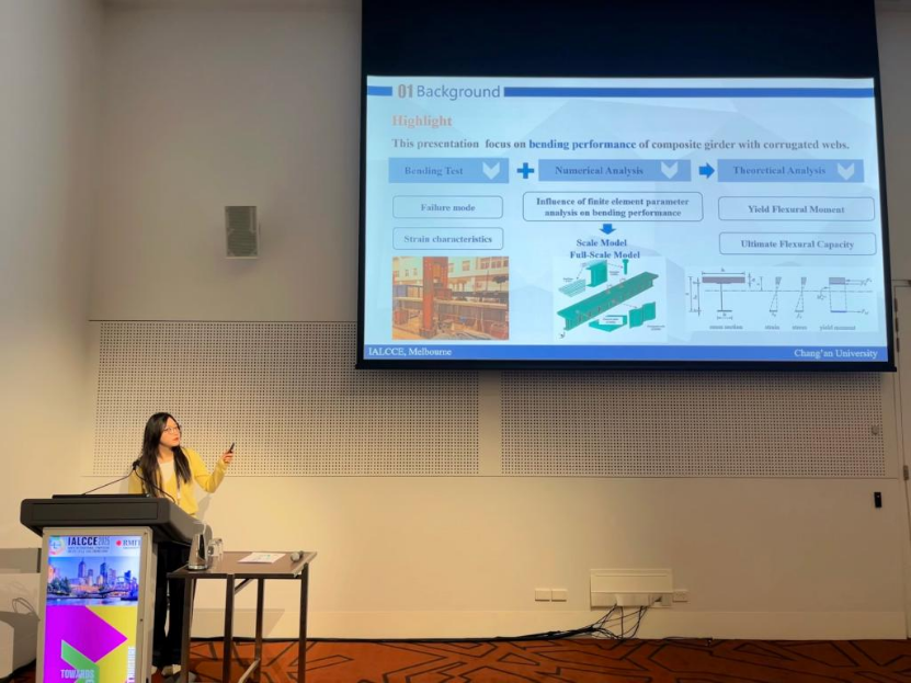 In the academic session, Professor Wang Chunsheng chaired the sub-forum on "Lifecycle Design for Structures and Infrastructure" and delivered two presentations: "Study of Thermal Gradient Fatigue Load Model for Flat Steel Box Girder Bridge" and "Mechanical Performance Simulation of Steel-Concrete Connection Section of Composite Bridge Tower." Associate Professor Duan Lan presented her research titled "Hybrid Connecting Interface Optimization for UHPFRC Composite Steel Bridge Deck," while doctoral student Li Xi shared findings on "Bending Performance of Composite Steel Plate Girders with Corrugated Webs." These four presentations systematically introduced the team’s latest advancements in the field of long-life bridge design, attracting significant attention from conference experts.