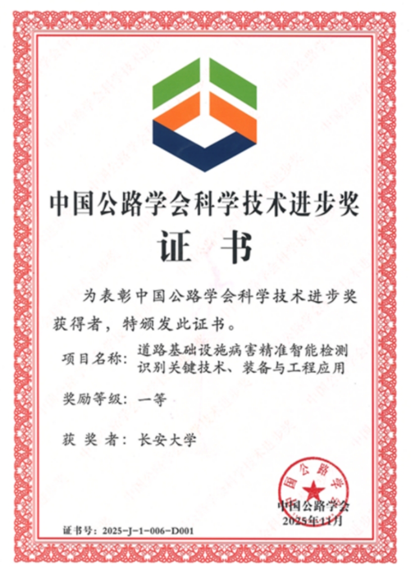 According to the earlier announcement of the "2025 China Highway and Transportation Society Science and Technology Awards" by the China Highway and Transportation Society, the School of Highway Engineering won a total of 9 awards, including:1 First Prize (leading 1 project),5 Second Prizes (first author of 1 project),2 Third Prizes,1 Innovation Team Award (leading).