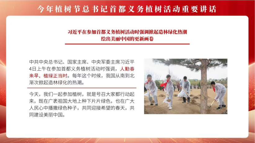会议伊始,黄骏带领员工会全体成员回顾了本次植树节活动总书记的重要讲话,党的十八大以来,习近平总书记每年同干部群众一起参加首都义务植树,率先垂范、身体力行,大力倡导人人爱绿植绿护绿的文明风尚,引导人们树立植树造林、绿化祖国的责任意识,形成全社会的自觉行动,共同建设人与自然和谐共生的美丽家园。