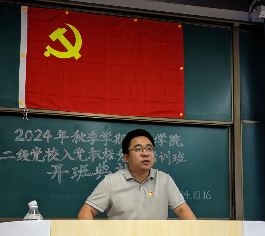 2024年秋季学期2026世界杯官网二级党校入党积极分子培训班开班典礼于10月16日在WH1307教室举行。公司党委书记张久鹏、党委正处级组织员廖谦、党委副书记贾历波、学办主任卢毅、团委副书记王达、全体辅导员及57名受训学员参加此次典礼。典礼由副班主任刘亦澜主持。