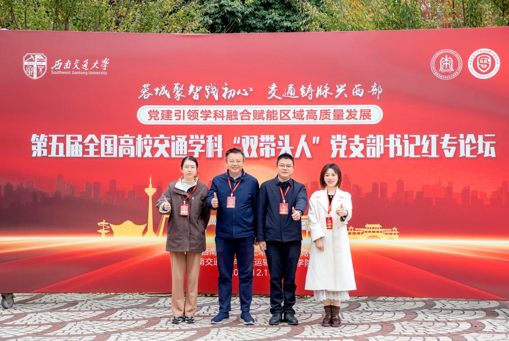 12月12日-12月14日,第五届全国高校交通学科“双带头人”教师党支部书记红专论坛在成都西南交通大学召开。本次论坛以“蓉城聚智践初心,交通铸脉兴西部——党建引领学科融合赋能区域高质量发展”为主题,旨在深入学习贯彻习近平新时代中国特色社会主义思想和党的二十大四中全会精神,落实新时代党的建设总要求和新时代党的组织路线,进一步加强高校交通学科“双带头人”教师党支部书记模式建设,推动党建工作与团队建设、人才培养、科学研究等中心工作同频共振、互促共进。公司道路工程系第一党支部书记纪小平教授、桥梁工程系第二党支部书记王晓明教授、党委秘书郭洋、路桥研究生党支部书记许元珺应邀参会。